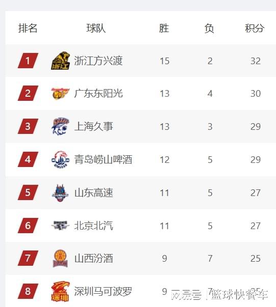 积分榜第5名则是山东队,这一轮比赛,山东队在客场以微弱的优势险胜吉林队,成功拿到赛季第11胜。截止到目前,山东队的战绩为11胜5负,尽管球队少赛一轮,不过,山东队还是成功杀进了积分榜第五名。排在积分榜第6名则是北京队,他们的战绩也是11胜5负。而排在第7名则是山西队,他们目前的战绩是9胜7负。深圳队则紧随其后,他们的战绩也是9胜7负,排在积分榜第8名。第9名则属于浙江队,他们的战绩也是9胜7负。