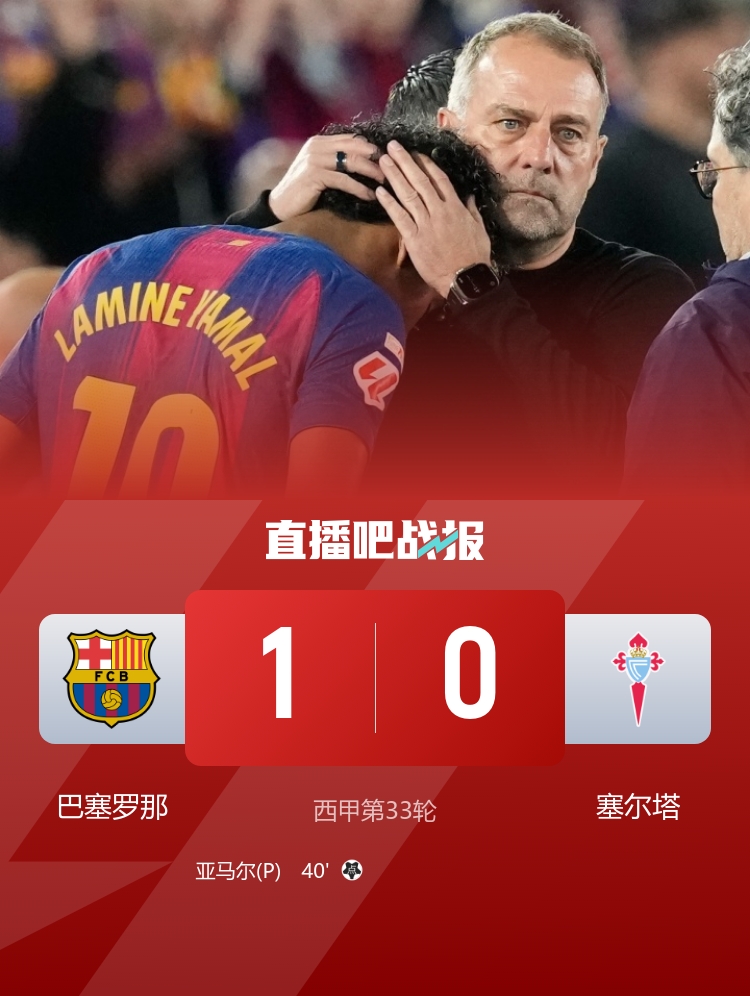 西甲第33轮,巴萨vs塞尔塔。上半场比赛尾声,亚马尔打进一粒点球,但随后他出现伤情无法坚持,被换下后直接回了更衣室。