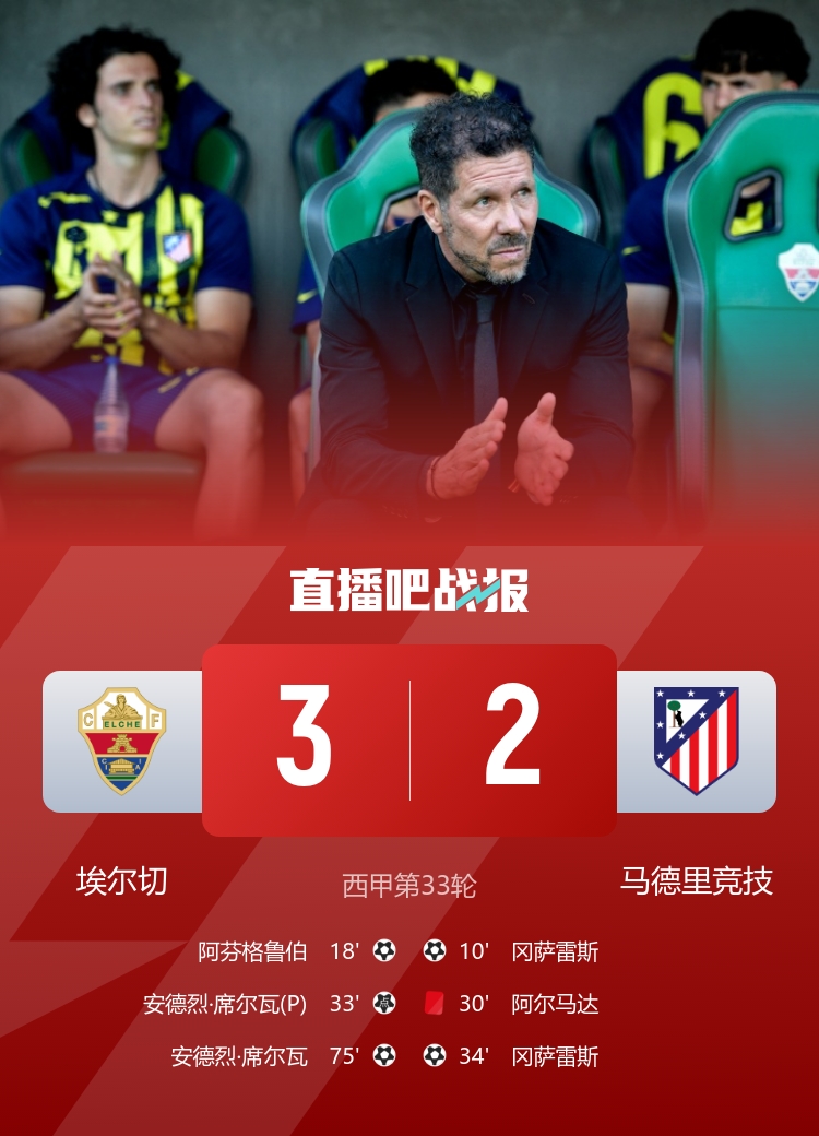 4连败!十人马竞2-3埃尔切继续第四 阿尔马达染红+送点尼科双响
